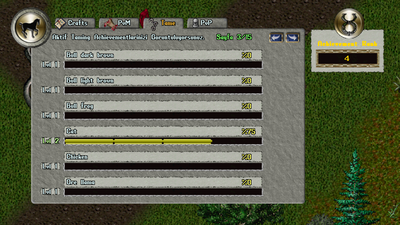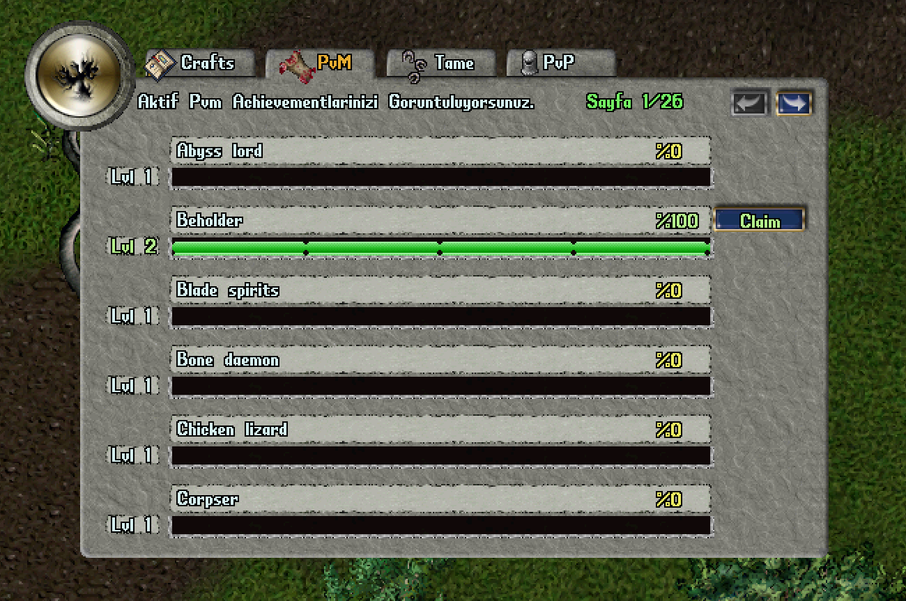 Kapsamlı Başarı Takibi: Crafting’den PvM savaşlarına, Taming’den PvP mücadelelerine kadar tüm aktiviteler için ayrı başarı kategorileri bulunur.